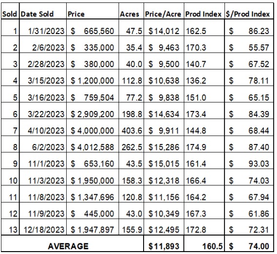 After several years of significant increases in value, price per acre values rose in 2023 and appear to be starting to stabilize into 2024.