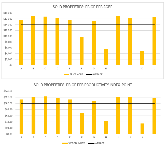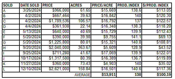 Overall, the average price of farmland was $13,911/acre and the price per productivity index point was $100.19 in 2024 based on the sales data. It is important to note that in 2024 there have been farmland sales as high as $17,069 per acre.