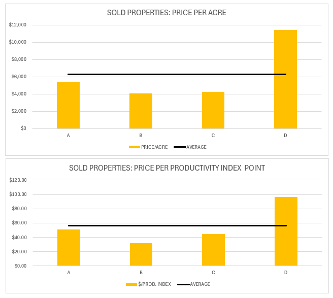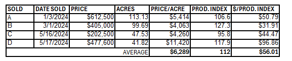 Overall, the average price of farmland was $6,289/acre and the price per productivity index point was $56.01 in 2024 based on the sales data. It is important to note that in 2024 there have been farmland sales as high as $11,420 per acre.