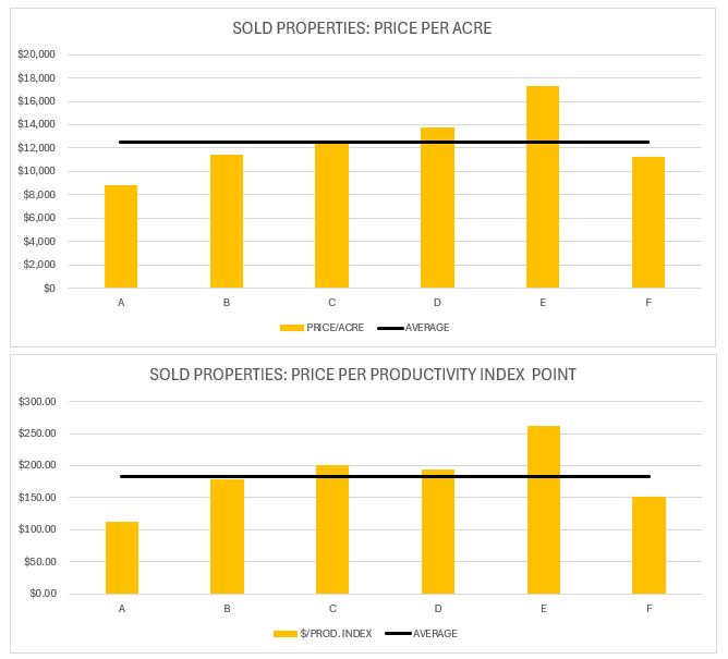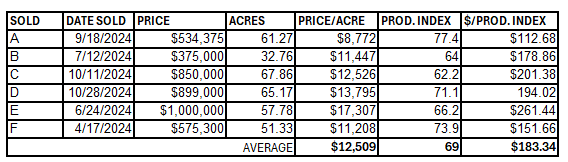 Overall, the average price of farmland was $12,509/acre and the price per productivity index point was $183.34 in 2024 based on the sales data. It is important to note that in 2024 there have been farmland sales as high as $17,307 per acre.
