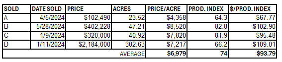 Overall, the average price of farmland was $6,979/acre and the price per productivity index point was $93.79 in 2024 based on the sales data. It is important to note that in 2024 there have been farmland sales as high as $8,520 per acre.