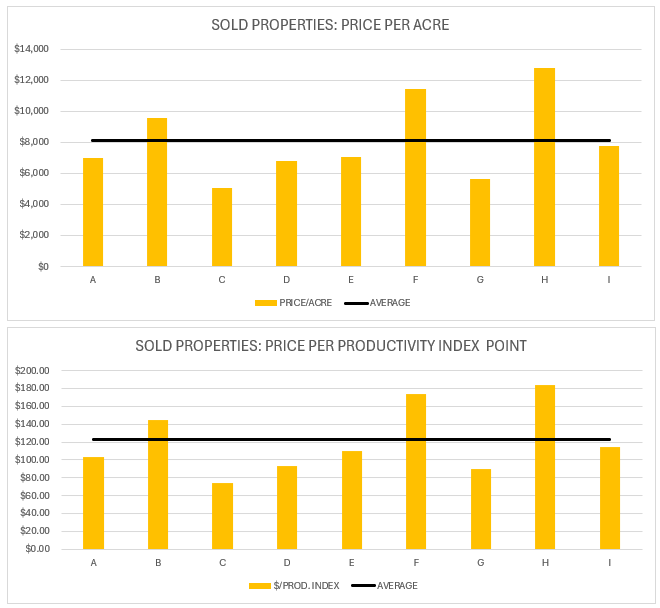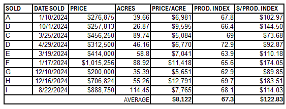 Overall, the average price of farmland was $8,122/acre and the price per productivity index point was $122.83 in 2024 based on the sales data. It is important to note that in 2024 there have been farmland sales as high as $12,791 per acre.