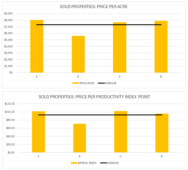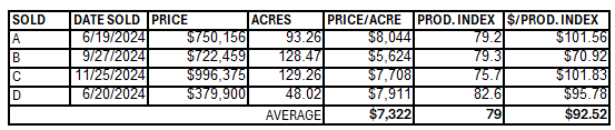 Overall, the average price of farmland was $7,322/acre and the price per productivity index point was $92.52 in 2024 based on the sales data. It is important to note that in 2024 there have been farmland sales as high as $8,044 per acre.