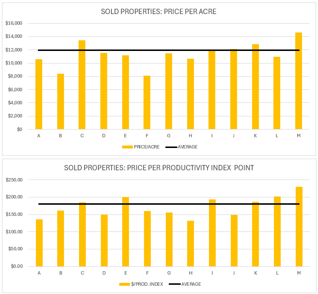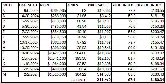 Overall, the average price of farmland was $11,975/acre and the average price per productivity index point was $180.34 in 2024 based on the below sampled data. In 2024, we have seen farmland prices in White County as high as $14,633 per acre.