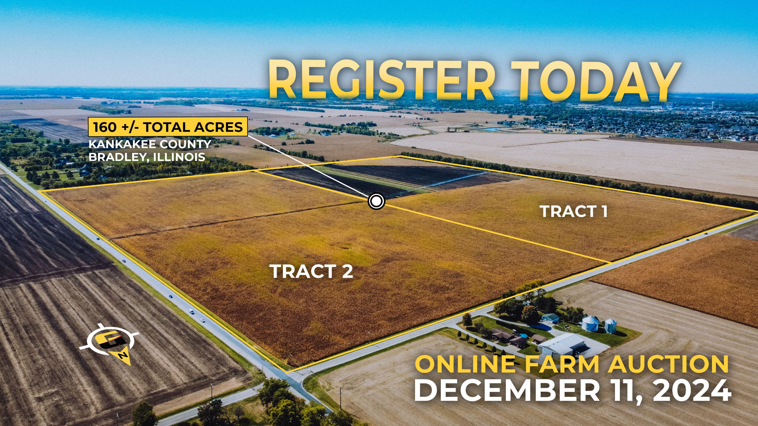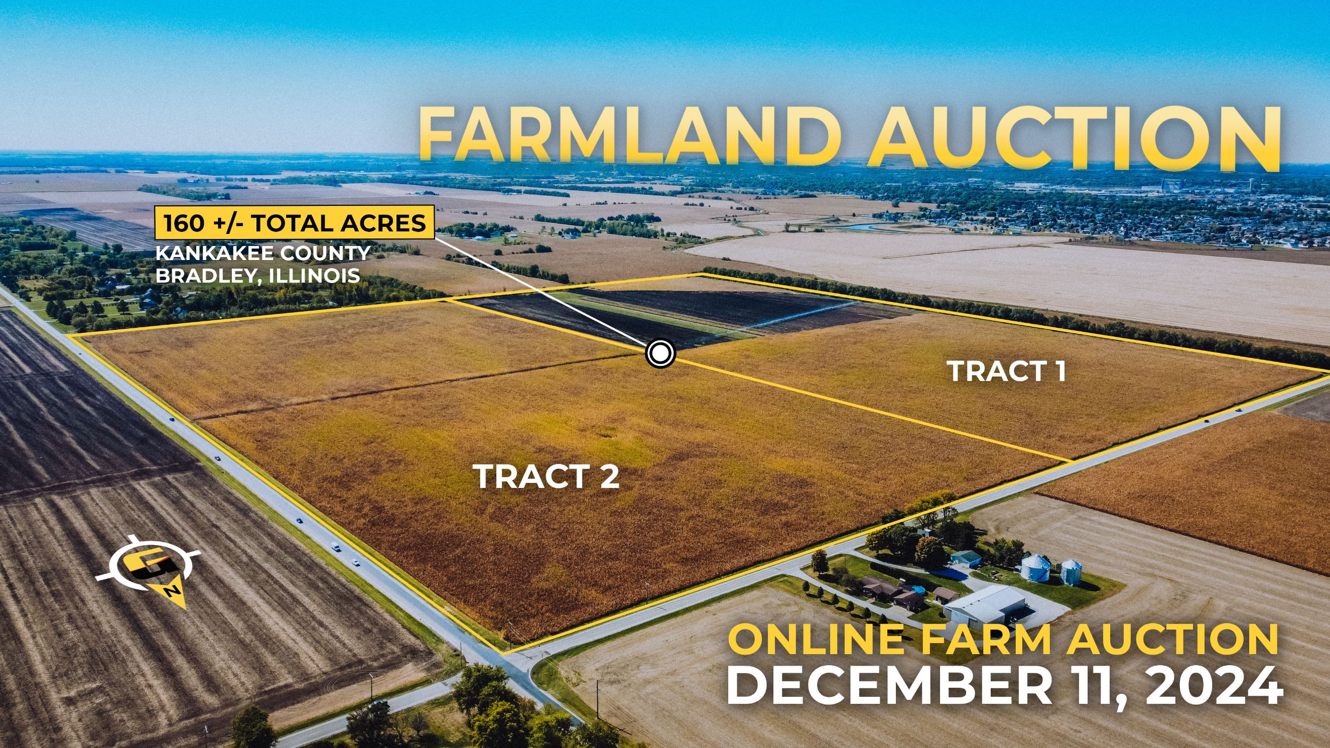 Join us for a farm auction on December 11, 2024, where we are offering two tracts of land located at the corner of E 4000 N Rd and N 4000 E Rd, conveniently situated just east of the Bradley city limits. This property boasts +/- 153.9 acres of FSA Crop Acres, featuring a productivity index of 120.4 - an excellent investment for agricultural use. Additionally, there may be potential develop-ment opportunities worth investigating. Please note that irrigation pivots, pumps, and above-ground piping are not included in the sale of the real estate, though the purchase of irrigation equipment can be negotiated separately. Confidential offers & private sale will be considered prior to auction. Contact Jeremy Thompson to discuss confidential offers at (815) 351 – 5572.