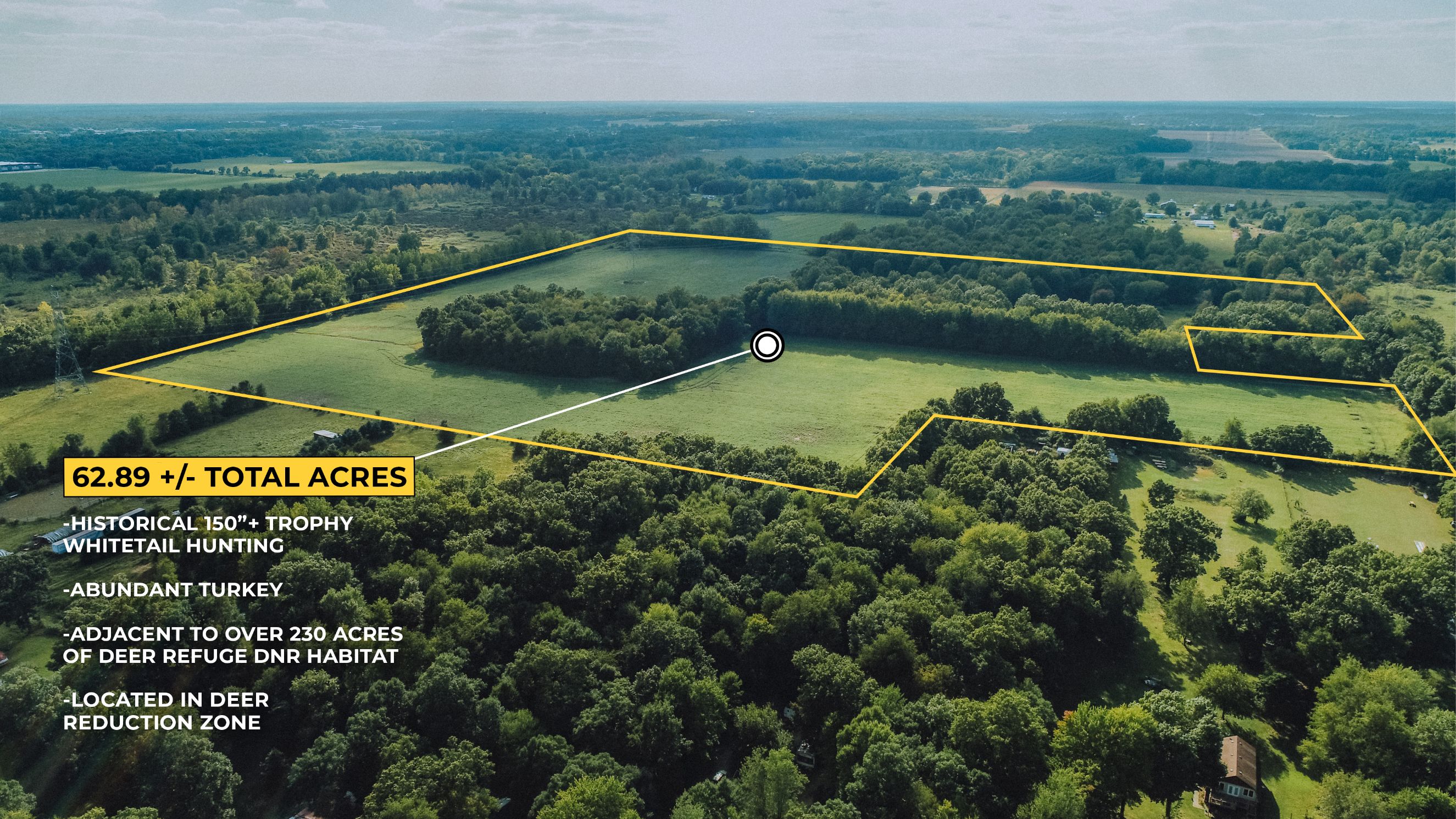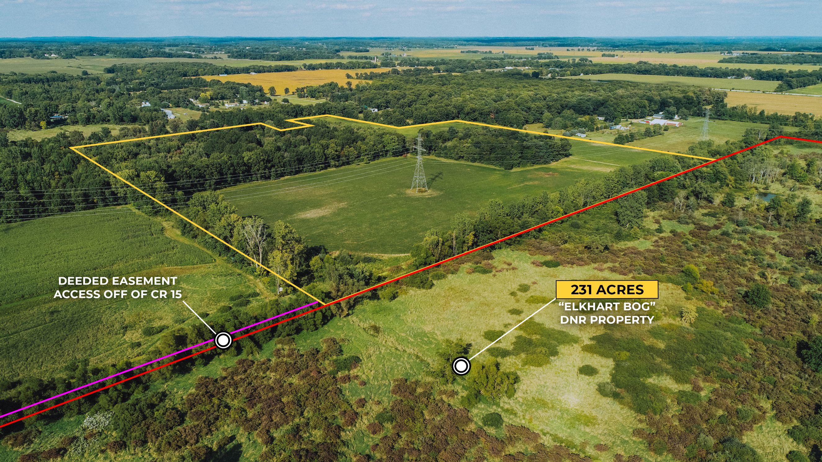 Ever dreamed of owning a one-of-a-kind hunter's paradise? Now is your chance! This +/- 62.89 acre property has numerous potential build sites to create your homestead. Property has a great mix of diverse habitat that consists of 36 +/- acres of income producing tillable ground and 26 +/- acres of mature timber, all of which is adjacent to a massive 231 +/- acre DNR property (Elkhart Bog) that acts as a safe haven for Mature Bucks. This property is turnkey to start hunting With a well-maintained trail system for ATVs throughout the property, established food plots, natural bedding areas, and a few tower blinds on the property. Numerous rubs, scrapes, and tracks are prevalent throughout the entire farm. Parts of the woods are mature, with successional areas providing great cover and corridors for wildlife. There is even potential for conservation programs that could be income producing and/or reduce your future property taxes. Property contains diverse timber species consisting of various oak species, hickory, and maple. There are natural water features that border the southern and western sides of the property, providing sources of water for wildlife. There is also plenty of space to build a farm pond to further compliment the diverse habitat. Located within the South Bend/Mishawaka/Elkhart deer reduction zone that provides an extending deer hunting season. Current dates run from September 15th, 2023, through January 31st, 2024. Use of firearms within these areas is legal from November 18th through January 31st. These dates and rules within the zone are always subject to change at the discretion of the Department of Natural Resources. Accessible from CR15 through an established easement lane through adjacent 25 +/- acre property, which is also currently listed for sale by Jacob Hogan with Geswein Farm and Land. Call today to schedule a private showing : (765) 366-6328