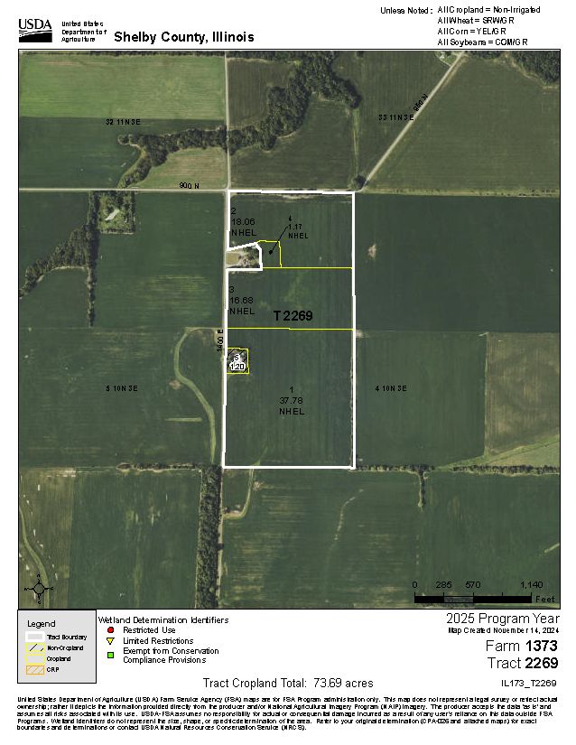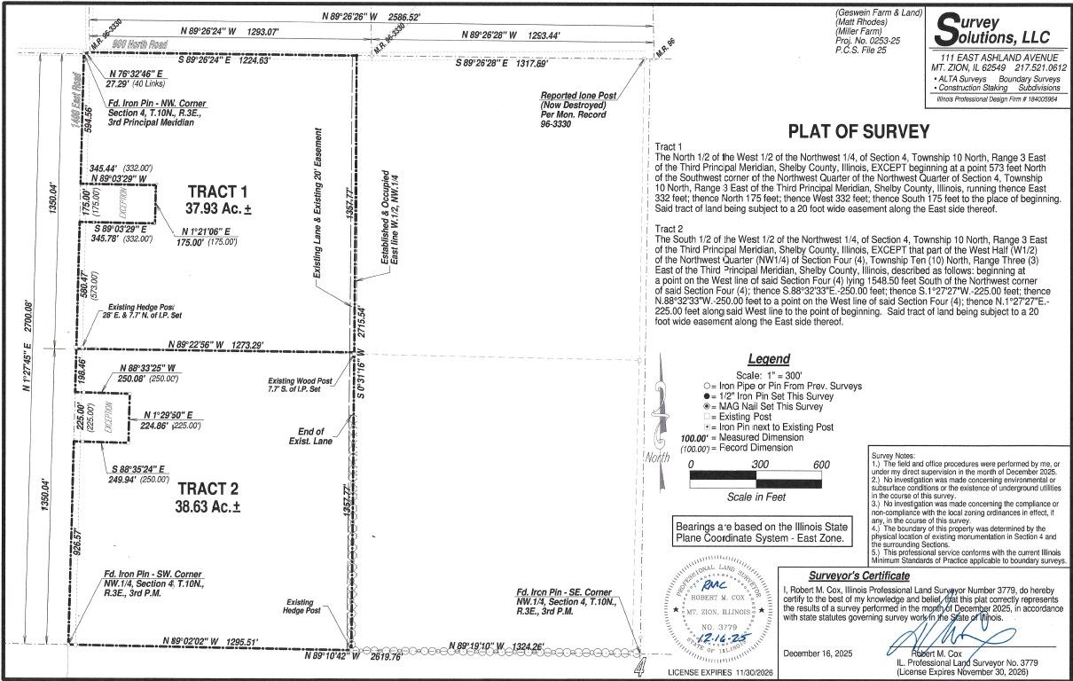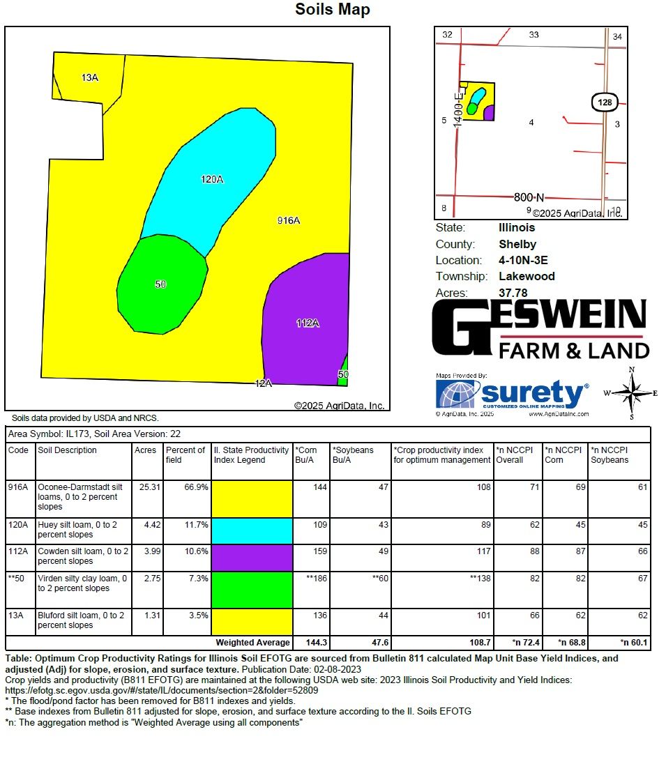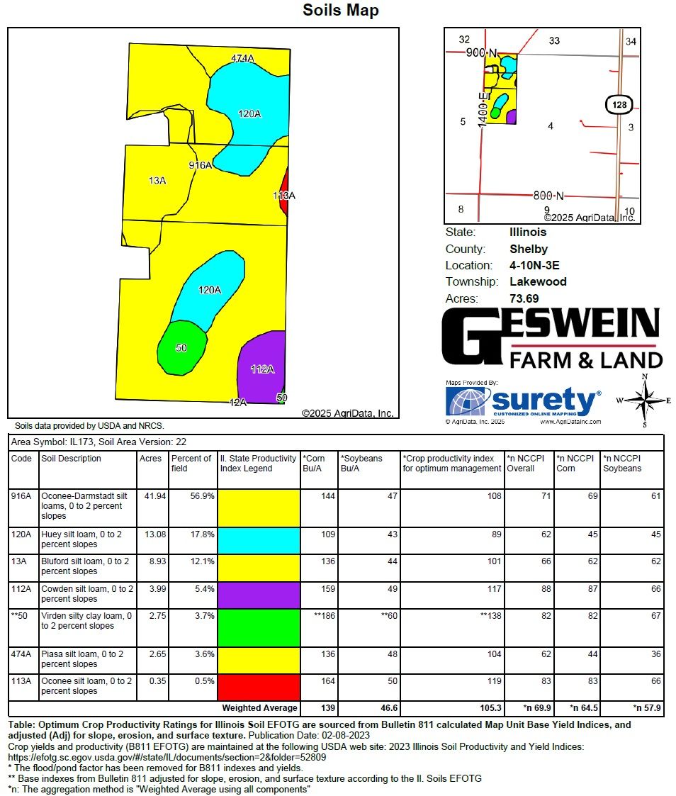 The Miller Family Farm is being offered in two tracts via Bidder's Choice Auction Method. Total acreage for the property is per the survey. Farm is offered as North Tract - 37.93 Surveyed Acres and South Tract - 38.63 Surveyed Acres; high bidder may choose both tracts. The Miller Farm lays very well with a gentle slope allowing surface water to exit the farm to the northeast and the south providing excellent overall drainage. The property is highly efficient, square in shape with frontage along the north to 900 N and along the west to 1400 E. The property is located 4 miles southwest of Shelbyville and 1 mile northeast of Lakewood in Section 4 of Lakewood Township, Shelby County, IL. The property has been well-maintained and boasts a tremendous yield history. 4-year corn average of 216.7 bu/ac and 4-year soy average of 61.2. Most recent soil test results were 6.36 pH, 52.5 P, 216.7 K. The property primarily consists of Oconee-Darmstadt Silt Loam soils with smaller portions of Huey Silt Loam, Bluford Silt Loam, Cowden Silt Loam, Virden Silty Clay Loam, Piasa Silt Loam and Oconee Silt Loam. The overall Soil PI is 105.2. The North Tract Soil PI is 101.7 and the South Tract Soil PI is 108.7. The North Tract contains a small shed and the South Tract is not improved. The Miller Farm is being offered with an open lease for the 2026 crop year. The farm will be sold at a live auction event at The Foxmore, 222 E. Main St., Shelbyville, IL at 1 P.M. CST on Wednesday, January 28th, 2026. Online bidding is available and online bidders must pre-register. FSA Information: Farm#: 1373 Tract#: 2269 FSA Cropland Acres: 73.69 HEL Status: NHEL (Non-Highly Erodible)